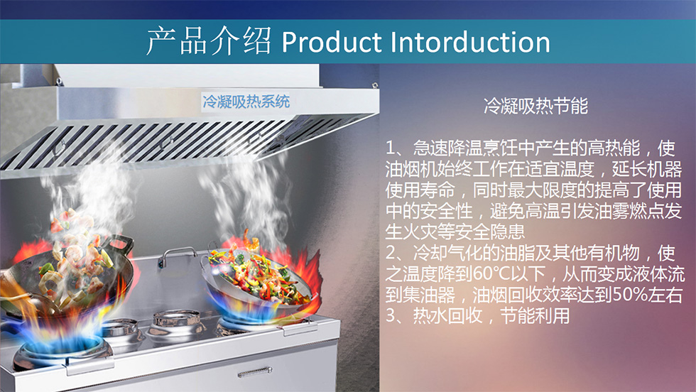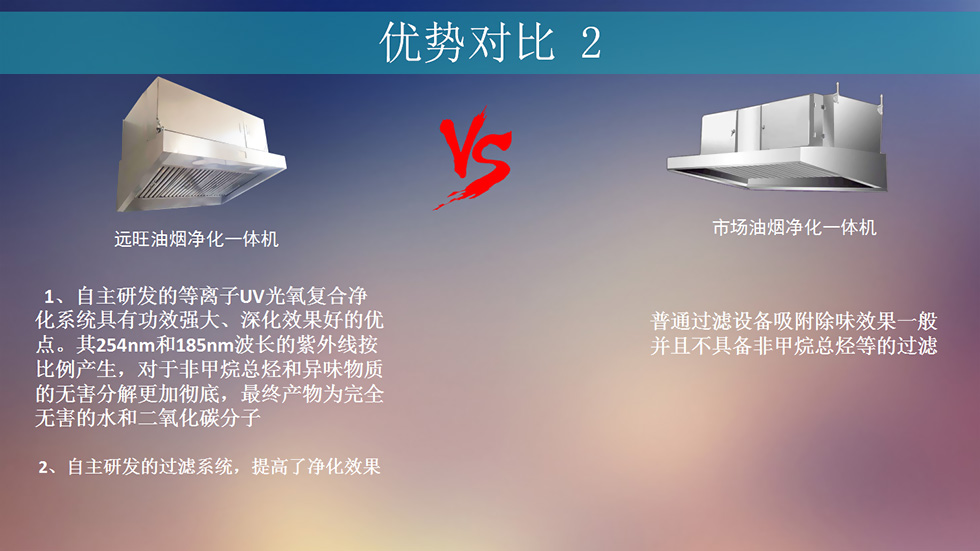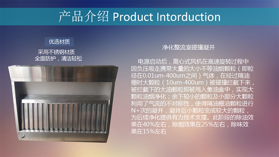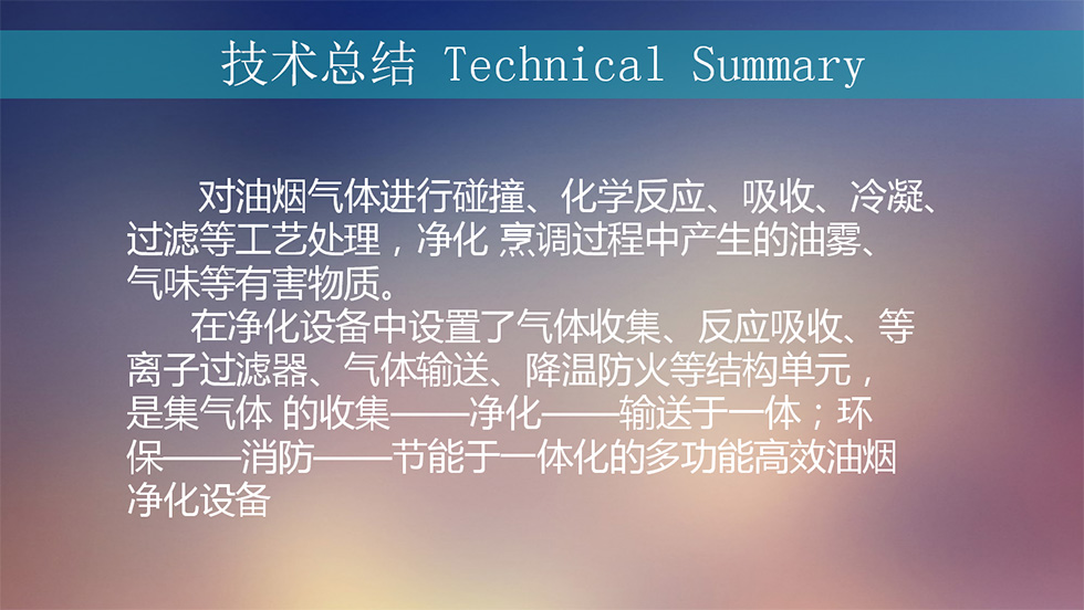 在净化设备中设置了气体收集、反应吸收、等离子过滤器、气体输送、降温防火等结构单元,是集气体的收集——净化——输送于一体;环保——消防——节能于一体化的多功能高效油烟设备。
