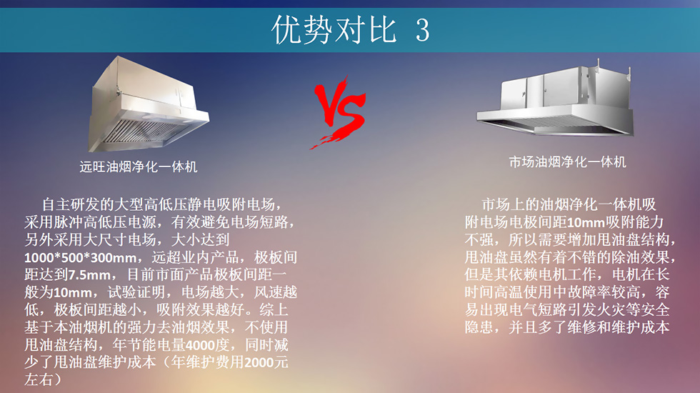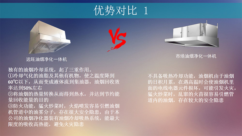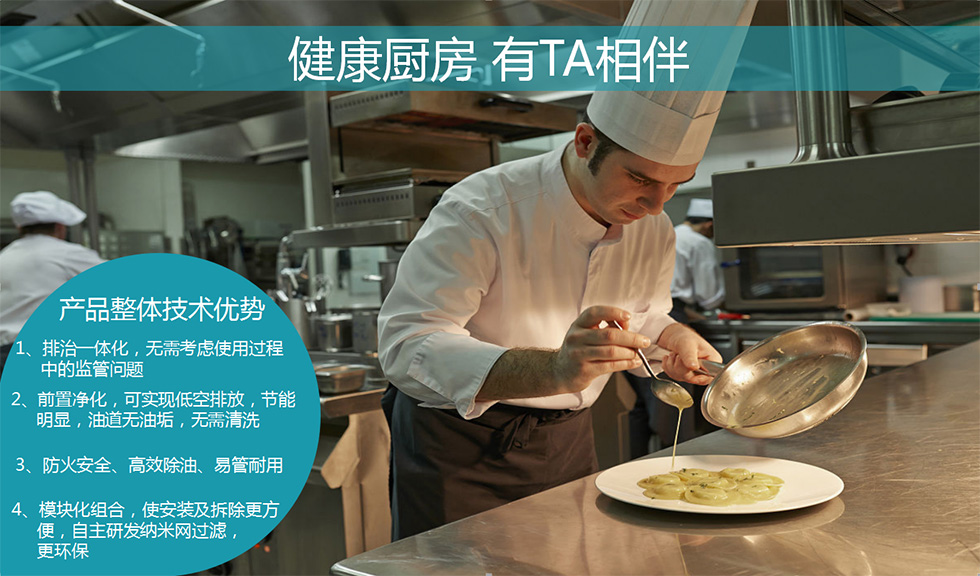 我公司始终坚持遵循以技术为主的指导方针,使命是与科技同步发展,并不断创新的基础上,确保每一位客户都能得到最新的技术。公司核心研发团队发现餐饮油烟治理行业的核心难点在于治理效果低下及治理手段不科学(能耗高,二次污染严重,综合管理成本高等)根据传统油烟机的体积大,排风管占用空间大,油烟污染严重等弊端,研发出了高效油烟净化一体机系列产品,以适用于我国可持续发展战略,落实的《饮食业油烟排放标准》。